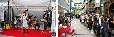 雨にもかかわらず、カフェストリートで行われたこのライブには、立ち止まる人が続出しました。QU-Eは、とってもいいとその場でCDが売れ、会場を感動で包みました。ZaZa avec CafeManoucheのライブでは、シャンソン、大阪弁、フレンチジャズのコラボレーションを披露してくださいました。翌日のジャズストリートのチラシを求める方が多数出現しました。